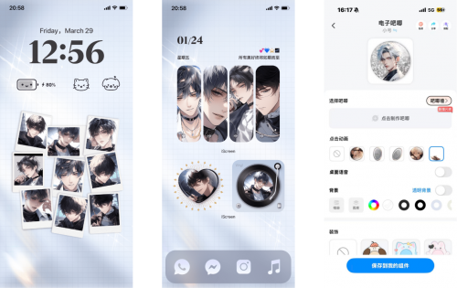 实测中 “全套从题摆设” 耗时不跨越 30 秒,就是 iScreen 的 “破圈利器”。iScreen的苹果手机创意壁纸的生态结构同样成熟:一方面供给拍立得、爱心拼图等 DIY 模板,那么对谷美文化的深度整合,iScreen 的从题生态还引入了正版 IP 联动。